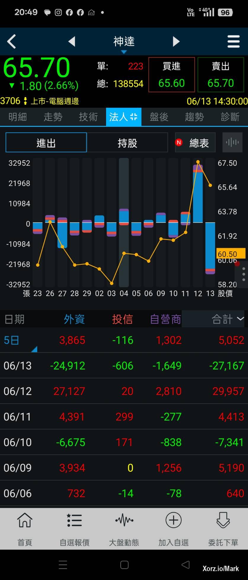 6/13 法人動向: 法人態度急轉直下,合計大賣 -27,167 張,主要賣壓來自「外資 -24,912 張」。這明確指出「短線高檔獲利了結」的跡象。