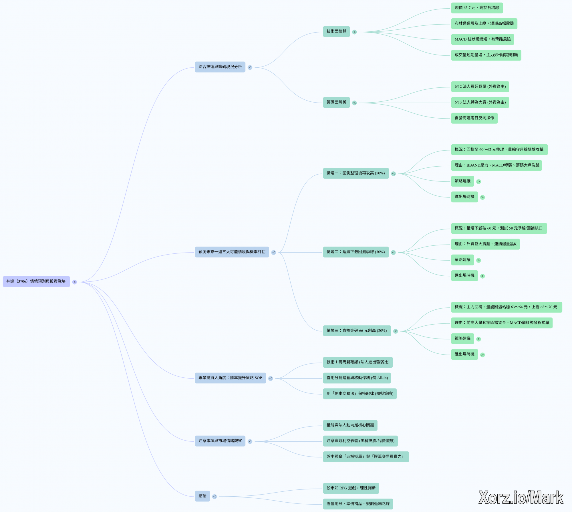 情境三:直接突破 66 元創高 (機率 20%):如果 6 月 14 日至 6 月 17 日主力回補,量能回溫並站穩 63~64 元,則有機會帶量突破前高 65.7 元,上看 68~70 元壓力區。